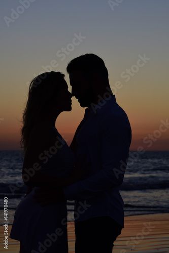 Liebe Paar Silhouette Bei Sonnenuntergang Am Strand Leinwandbilder